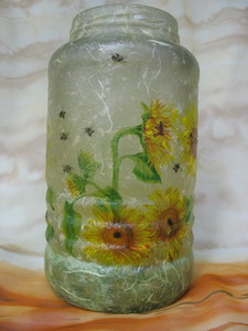 Zuerst wurde das Glas komplett mit Strohseide-chamois umkelbt. Eine Serviette mit Sonnenblumen und Bienen dienen als Motiv. Jedes Motiv sollte einzeln und vorsichtig abgerupft werden. Wird das Motiv geschnitten, sieht dies später nicht schön auf dem Glas aus. Die Ränder sind dann ganz deutlich zu sehen - wird die Strohseide gerupft führt das beim Aufkleben zu weichen Übergängen.